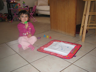 Holly received a LOT of gifts for Christmas but we haven’t opened everything up just yet. I’m pulling things out as needed. Well yesterday she needed something different to play with so I opened her new AquaDoodle. It’s like the MagnaDoodle only you use water and there is NO MESS AT ALL. Well she absolutely LOVED IT! (Thanks Cuozzo Cousins!). She sat there for about 45 mins (which is a long time in toddler land) and just wrote and stamped her little heart out. The mat is made with special material that turns blue when anything wet hits it and then disappears when it drys. It’s never ending fun. I was so happy she enjoyed it so much. This morning the first thing she did when she got up was pull out her AquaDoodle and start doodling! So much fun to be a 2 year old!
