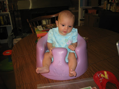 Allison loves her Bumbo!!! and so does Mommy. While I cook dinner, if she’s up (and if I cook) I put her in the Bumbo up on the counter and she watches me. She really seems to enjoy that. As long as she can see mommy, she is pretty much happy.