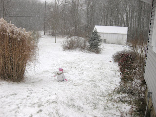 We got a LOT of snow today. Holly was so excited. It was supposed to start in the morning but it didn’t begin until about 1pm. Holly took a short nap and when I woke her it was snowing and she was so excited. We put on her old snow suit (she is getting a new one for Christmas but don’t tell her that) and her rain boots because she didn’t like the way the new boots fit her, and out in the snow we went! She wanted to use her sled but there wasn’t enough snow to sled but she had fun anyways………….as you can see!