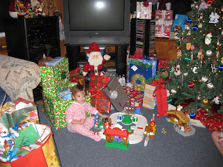 Allison has on a Baby’s 1st Christmas bib even though it’s not her 1st Christmas but the other one was no where to be found. I washed it, but I think Allison put it in her laundry basket, she likes putting clean cloths in there. 🙂