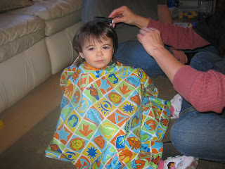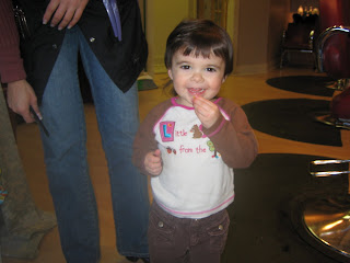 Then we had to break for haircuts. Steve and Holly both needed haircuts so we went to see Betsy today. This was the first time we were attempted to have someone cut Holly’s hair. I’ve been doing it myself but I’m not doing a great job so we needed to call in the professional. First Steve got his hair cut, then it was Holly’s turn. She did not want to sit on Steve’s lap so Betsy sat on the floor with her. That worked for Holly. She loved getting her hair sprayed with water and she sat very well for Betsy. She did get a little antsy after a little while but there wasn’t much to cut. She just trimmed her bangs and evened off the back. The rest we are letting grow. We were so proud of her, she even got some M&M;’s for sitting so nicely. Here are some pictures of her haircut………