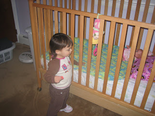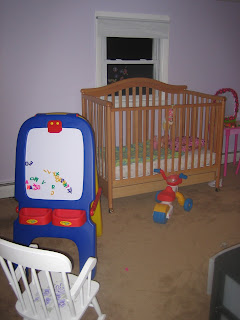 Bedtime went pretty good. She didn’t seem to mind as we put her to bed, but once we shut the door she began to cry. After a little while mommy went in and told her it was ok and turned on her music again. Then she cried for a little while more so daddy went in and told her that this was her new room because she was a big girl and baby sister was going to have her old room and it was ok, mommy and daddy were here and she was fine, she had pink teddy and baby doll and her dora pillow so all was good. That seemed to work because she hasn’t made a peep since then. Here’s a picture of her in her new room (in her old crib LOL).