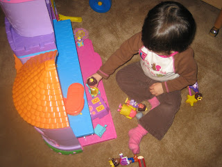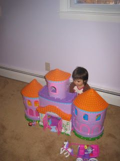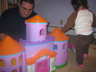 Finally we began to open up her gift from Nana and Poppa. The Dora castle with all the works. Once again she wanted to help mommy and daddy take everything out of the box. She really is a good helper. She was so excited as we began pulling out all the pieces. It was so much fun to see her excitment. Makes all the work worth it. Once we got it all out, we noticed that the castle comes with a magic wand that opens up things when you pass over the stars. It really is the neatest thing. We showed her how to do it and she loved it.