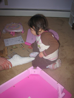 When we got back home, we began filling Holly’s room with all the fun things she got for Christmas. It was like Christmas morning all over again. First we opened up her Easel that she received from Uncle John and Auntie Kara. Well she LOVED it!!! She immediately started putting the magnectic ABCD’s (that is what she calls them) up on the board. What fun she had!