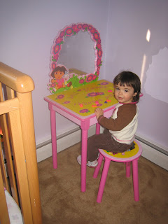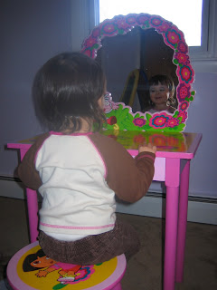 The we moved onto the Dora Vanity/Desk that she received from Jodi, Dave and Lil David. She helped mommy and daddy put it together, she’s such the little helper. We all absolutly loved this!! It’s perfect for her. And it’s a good size that will last her a while. She got right up on the chair and began looking in the mirror. It was so cute!!!