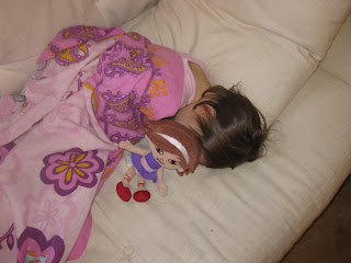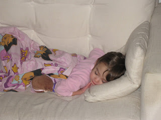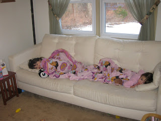 We’ve all been sick. First Allison, then Mommy, then Holly and finally Steve. The wonderful stomach and intestinal bug……… fun fun fun. We have been just lying around the house for a few days. I felt really bad for the girls, they were not themselves, but they were still cute. Steve took some pictures of the girls sharing the couch. Holly smiled, but Allison just couldn’t.
