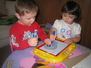 The two of them LOVE to draw. If they weren’t sitting at the easel drawing they were coloring on the floor or writing on the magna doodle. It’s something they both enjoy and really enjoyed doing it together.