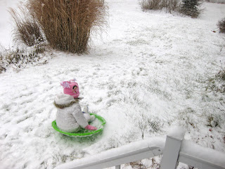 We got a LOT of snow today. Holly was so excited. It was supposed to start in the morning but it didn’t begin until about 1pm. Holly took a short nap and when I woke her it was snowing and she was so excited. We put on her old snow suit (she is getting a new one for Christmas but don’t tell her that) and her rain boots because she didn’t like the way the new boots fit her, and out in the snow we went! She wanted to use her sled but there wasn’t enough snow to sled but she had fun anyways………….as you can see!