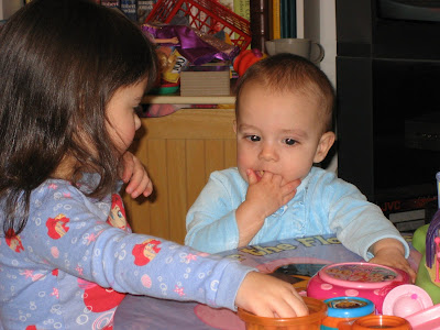 She loves to stand up and grab what ever Holly has on her Dora table too. We had to reorganize the toys this weekend since she can get into everything. This weekend while Holly was sitting having her Cheerios before bed, Allison decided she’d stand there, at the dora table, and have some Cheerios with her sister. It was so cute! Holly loved sharing them with her. Of course I snapped some pictures.