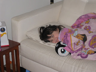 We’ve all been sick. First Allison, then Mommy, then Holly and finally Steve. The wonderful stomach and intestinal bug……… fun fun fun. We have been just lying around the house for a few days. I felt really bad for the girls, they were not themselves, but they were still cute. Steve took some pictures of the girls sharing the couch. Holly smiled, but Allison just couldn’t.