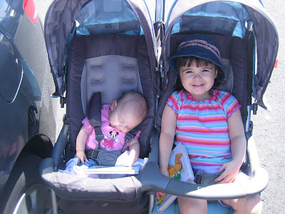 On our way there, we stopped at Walmart to see if they had a pool for Holly. We had to replace the one we had because we lost the plug to it and now the water won’t stay in it, imagine that. lol Anyways, it was the first opportunity to use the new double stroller that I got this week. Holly loved being next to her sister, she kept leaning over giving her kisses, it was really cute.